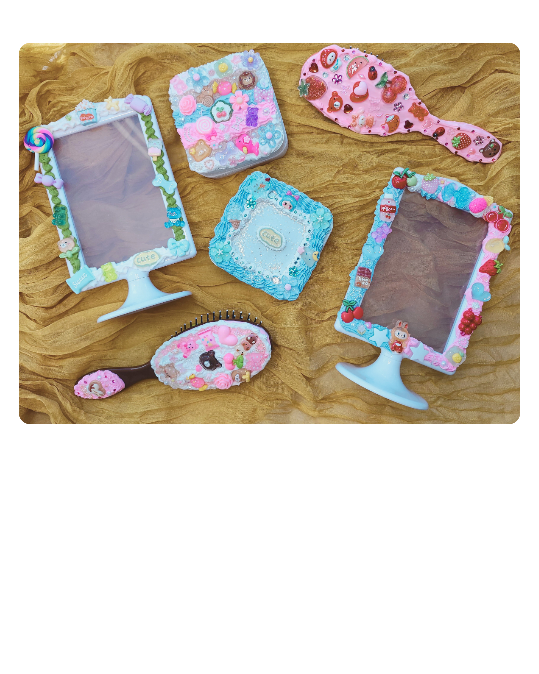 The process involves a unique, pipeable cream glue that dries to a solid finish, resulting in a "kawaii," or adorably cute, candy-like appearance. Decoden can be applied to various hard surfaces. Our kits offer you the option of decorating a jewelry box, hairbrush, or photo frame. Typically, there's enough cream glue remaining to embellish your personal phone case or any other items you'd like to adorn.